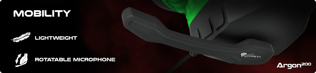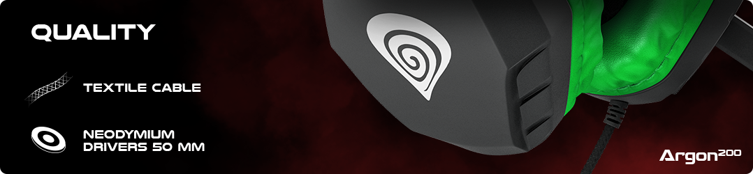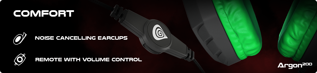 PERMANENT BRAIDED CABLE In Argon 200 there can be found a 2 meter long textile braided cable. Such solution prevents the cable from getting tangled or broken, thus the use of the device is significantly longer. In addition, the braided cable is stylishly finished and this is one of the identifications of the Genesis brand. COMFORT AND DESIGN Apart from a number of sound functionalities, the headphones are designed in a way which aims at providing maximum comfort when used. Large earmuffs are equipped with soft pads covered with ecological leather, whereas the internal band is padded out with soft fabric. Furthermore, the band is braided with eco leather from the outside in order to obtain up-to-date design. Such solutions combined with a modern shape bestow Argon 200 with the exceptional gaming character.