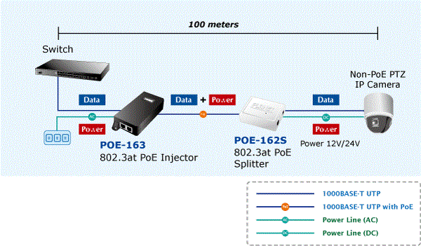 For remote non-PoE compliant Ethernet devices to enjoy the convenience of Power over Ethernet, the POE-163 and PoE Splitter operate as a pair to provide the easiest way to power your Ethernet devices which need high power input. For example, the POE-163 delivers the Ethernet digital data with power over the twisted-pair cable. When connected to PLANET POE-162S (IEEE 802.3at PoE+ splitter), the POE-162S will divide the digital data and the power into two selectable DC outputs (12V DC and 24V DC) to non-PoE Ethernet device. Or the POE-163 can co-work with the POE-152S (IEEE 802.3af PoE splitter) to get 5V DC/12V DC output.