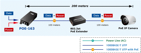 Is a 100-meter cable long enough for a wide range of IP Surveillance deployments? The answer is certainly not. To achieve the benefits of IP surveillance and also the long-distance IP camera distribution, the POE-163 and PLANET PoE Extender -- POE-E201 -- can be a quick and cost-effective option. In the simplest application, the PoE Extender enables a PoE IP camera to be installed up to 200 meters away from the POE-163. The POE-163 delivers PoE power over the first 100 meters to the PoE Extender over UTP cable, and then the PoE Extender forwards the Ethernet data and remaining POE power to the remote PoE IP camera.
