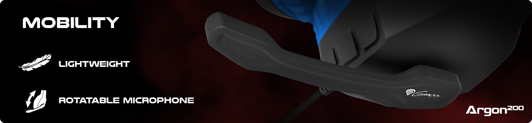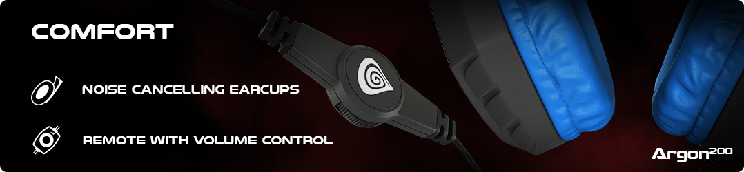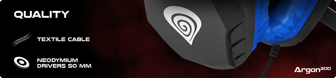 PERMANENT BRAIDED CABLE In Argon 200 there can be found a 2 meter long textile braided cable. Such solution prevents the cable from getting tangled or broken, thus the use of the device is significantly longer. In addition, the braided cable is stylishly finished and this is one of the identifications of the Genesis brand. COMFORT AND DESIGN Apart from a number of sound functionalities, the headphones are designed in a way which aims at providing maximum comfort when used. Large earmuffs are equipped with soft pads covered with ecological leather, whereas the internal band is padded out with soft fabric. Furthermore, the band is braided with eco leather from the outside in order to obtain up-to-date design. Such solutions combined with a modern shape bestow Argon 200 with the exceptional gaming character.