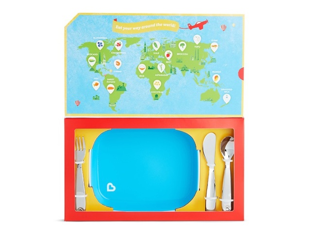 | MUNCHKIN ZESTAW UPOMINKOWY Z TALERZYKIEM I SZTUĆCAMI ZE STALI NIERDZEWNEJ NIEBIESKO-SREBRNYPodróżuj ze smakiem… Twoje ulubione jedzenie czeka! - Zestaw zawiera talerz Splash™, widelec, nóż, łyżkę wykonane z polerowanej stali nierdzewnej, mapę, papierowe naklejki oraz zabawkowy paszport - Zestaw obiadowy o tematyce podróżniczej z zabawnymi aktywnościami zachęcającymi wybrednych użytkowników do spróbowania nowych potraw - Opakowanie prezentowe inspirowane wakacjami dodaje ciekawego charakteru - Sztućce ze stali nierdzewnej pomagają maluchom przejść do pełnowymiarowych sztućców - Talerz wyposażony w antypoślizgową podstawę - Nie zawiera BPA - Produkt przeznaczony dla dzieci od 18 miesięcy |