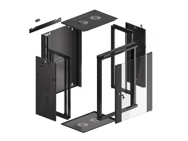 - Sufitowy i podłogowy panel zawiera 2 miejsca na wentylatory (120 x 120 mm) oraz wyłamywane przepusty kablowe,