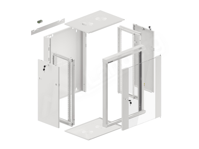 - Drzwi przednie: zdejmowane, z uziemieniem oraz z możliwością obustronnego montażu i obrotu do 180°, wyposażone w szybę hartowaną o grubości 5 mm oraz zamocowany zamek,