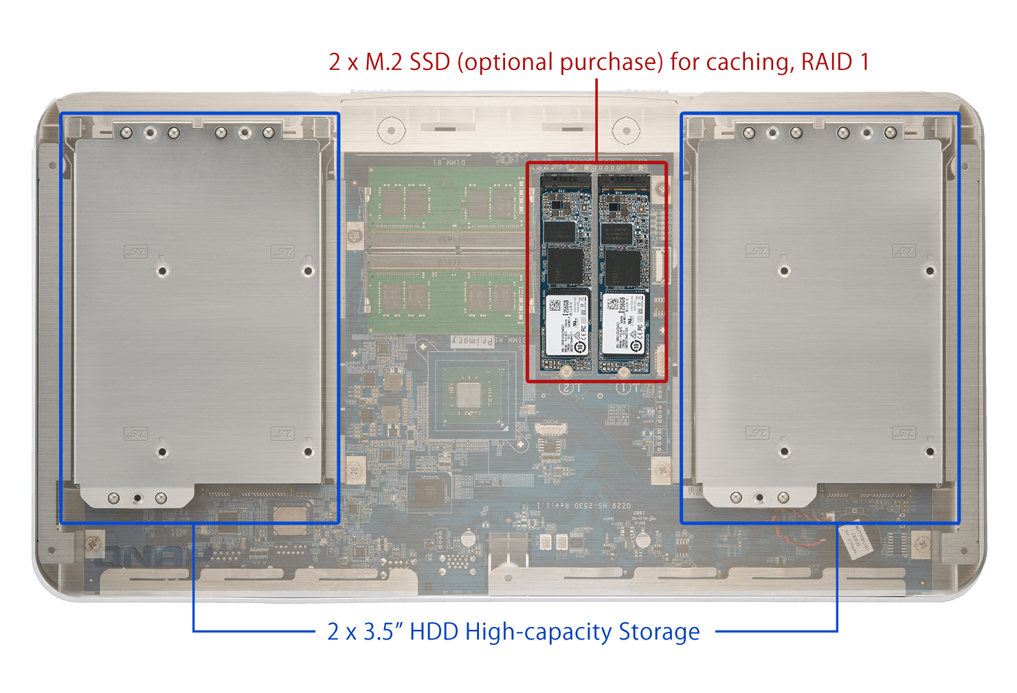 Dwa gniazda SSD SATA M.2 2280 do pamięci podręcznej SSD. Korzystanie z nadmiarowej alokacji SSD w celu zwiększenia wydajności stacji NAS.