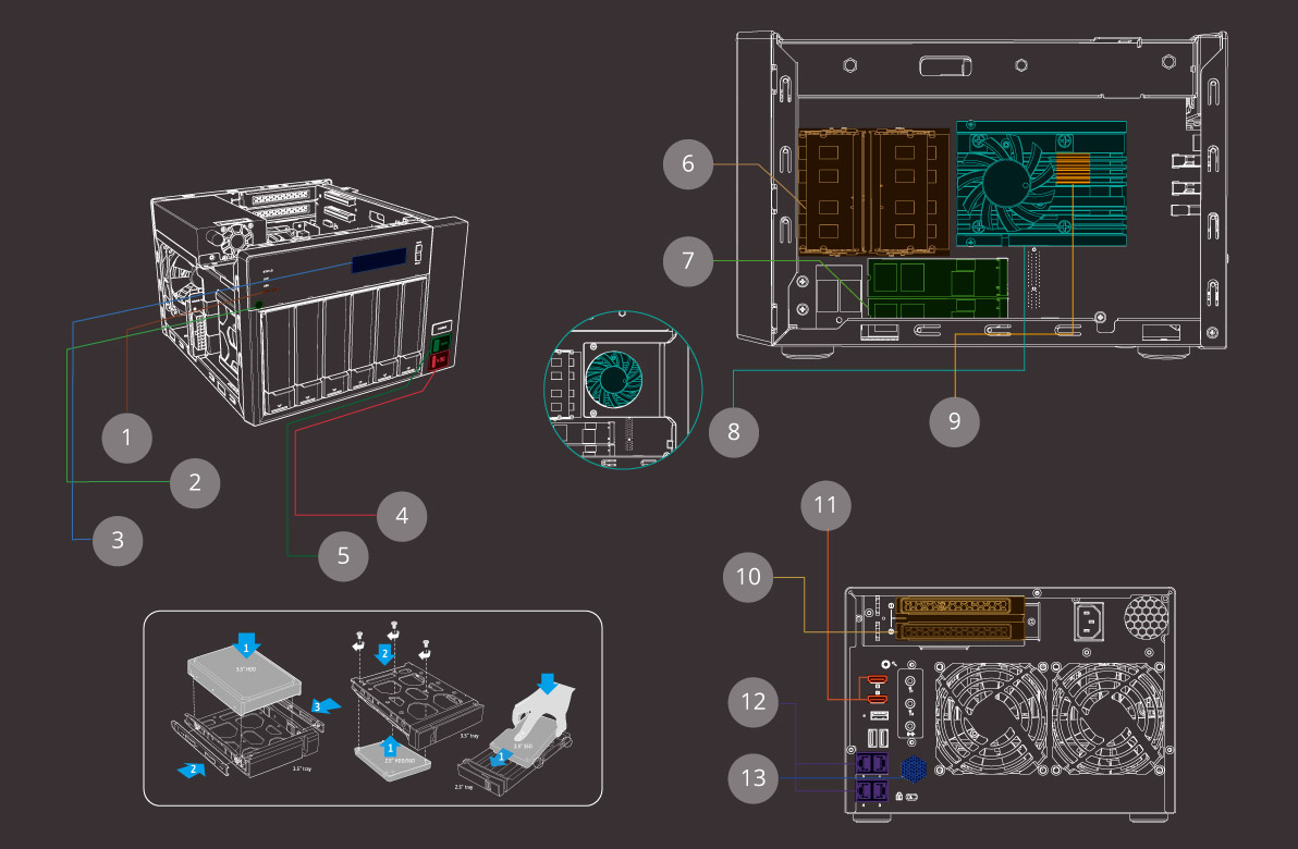Dwa gniazda PCIe obsługują karty 10GbE, karty QM2, karty USB 3.1 10 Gb/s oraz karty sieci bezprzewodowej.