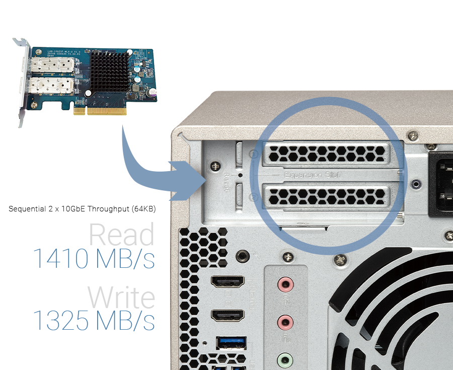 Serwer TVS-873e jest wyposażony w dwa gniazda PCIe (Gen3 x4), umożliwiające instalowanie opcjonalnych jedno-/dwuportowych kart sieciowych 10GbE w celu przyspieszenia pracy aplikacji wymagających większej przepustowości, takich jak procesy wirtualizacyjne, związane z multimediami oraz obejmujące archiwizowanie i przywracanie, przy wciąż rosnącej ilości danych. Alternatywnie można zainstalować kartę rozszerzeń USB 3.1 Gen2 (10 Gb/s) w celu przesyłania dużych plików multimedialnych do i z pamięci masowej USB. Funkcjonalność serwera NAS można również rozszerzyć, instalując karty QM2 lub karty sieci bezprzewodowej.