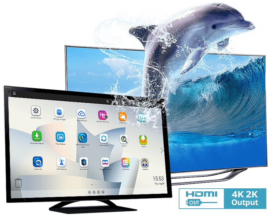Model TVS-873e charakteryzuje się architekturą GCN AMD 3. generacji i przełomową wydajnością karty graficznej obsługującej dekodowanie wideo 4K H.264 oraz świetnym wyświetlaczem UHD 4K. Oferuje wysokiej klasy funkcje transkodowania wideo w rozdzielczości 4K i 1080p, umożliwiające konwersję wideo na powszechnie stosowane formaty, które można płynnie odtwarzać na komputerach, urządzeniach mobilnych i ekranach telewizorów inteligentnych. Model TVS-873e zapewnia podwójne wyjście HDMI z obsługą konfiguracji „duplikowanego” lub „rozszerzonego” pulpitu. Możesz podłączyć serwer NAS do telewizora HDTV lub odbiornika audio-wideo i używać odtwarzacza multimedialnego w aplikacji HybridDesk Station (HD Station) za pomocą pilota QNAP (sprzedawany osobno) lub aplikacji mobilnej Qremote, aby oglądać bogatą zawartość multimedialną i wideo 4K przy 30 Hz w doskonałej jakości audiowizualnej.
