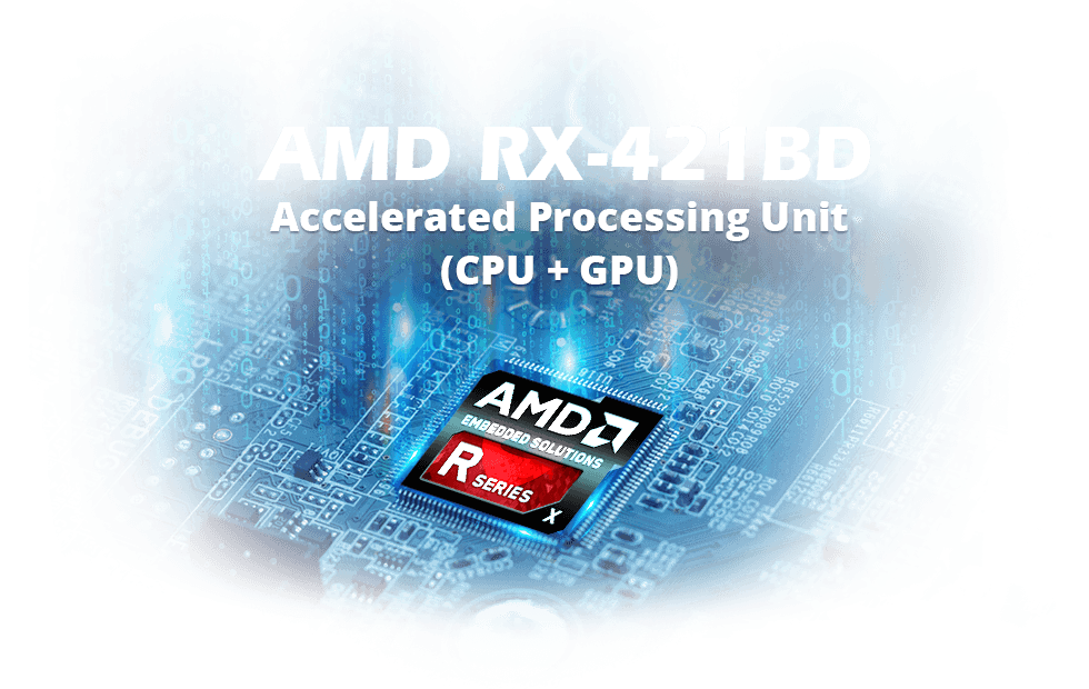 Czterordzeniowy procesor SoC RX-421BD 2,1 GHz (35 W), zwiększenie do 3,4 GHz; obsługa karty graficznej Radeon™ R7, przyspieszenie dekodowania i kodowania wideo 4K.