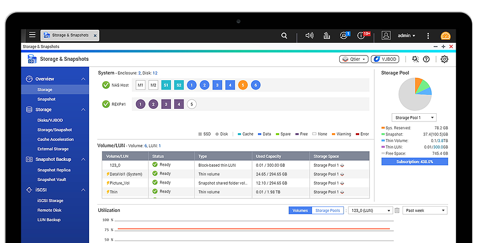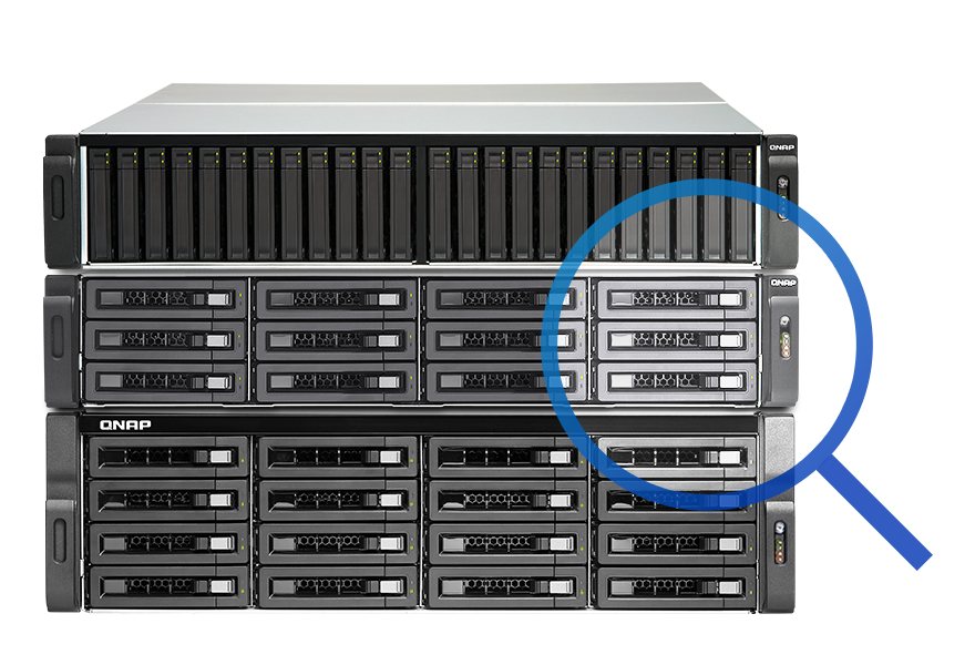 Menedżer pamięci masowej i migawek w systemie QTS w czytelny sposób prezentuje narzędzia i opcje do zarządzania pamięcią masową w ramach intuicyjnego interfejsu użytkownika, co znacznie upraszcza rozbudowę pojemności serwera NAS i zarządzanie modułem rozszerzającym REXP-1210U-RP. Administratorzy mogą łatwo monitorować kondycję modułu REXP-1210U-RP i zainstalowanych w nim dysków. W przypadku kaskadowego łączenia wielu modułów rozszerzających w stelażu funkcje „Zlokalizuj dysk” i „Zlokalizuj obudowę” bardzo ułatwiają szybkie wykonywanie prac serwisowych.