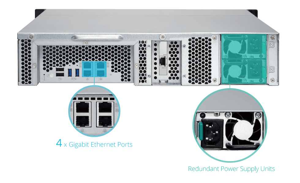 Serwer TS-1263XU-RP jest fabrycznie wyposażony w jednoportową kartę sieciową 10GBASE-T Ethernet, umożliwiającą pełną obsługę szybkich sieci 10GbE. Sieci 10GbE znacznie przyspieszają zadania wirtualizacyjne, tworzenie kopii zapasowych i odzyskiwanie danych oraz operacje wykorzystujące duże ilości danych, a także pozwalają na edycję plików wideo online bez konieczności przesyłania ich pomiędzy serwerem NAS a stacjami roboczymi. Potencjalnie duża pojemność pamięci masowej czyni serwer TS-1263XU-RP doskonałym rozwiązaniem dla firm, które wymagają przechowywania ogromnych ilości danych i dużej elastyczności systemów IT.