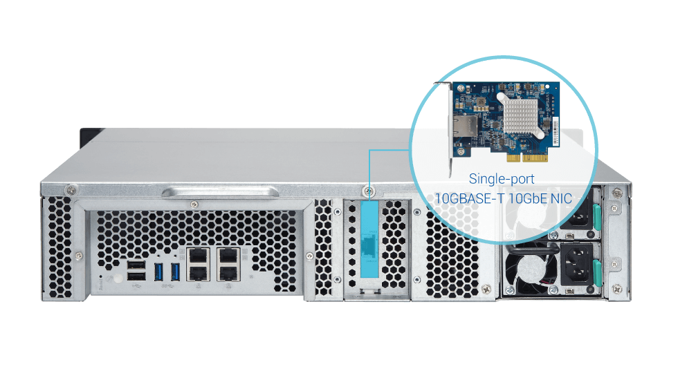 Serwer TS-863XU-RP jest fabrycznie wyposażony w jednoportową kartę sieciową 10GBASE-T Ethernet, umożliwiającą pełną obsługę szybkich sieci 10GbE. Sieci 10GbE znacznie przyspieszają zadania wirtualizacyjne, tworzenie kopii zapasowych i odzyskiwanie danych oraz operacje wykorzystujące duże ilości danych, a także pozwalają na edycję plików wideo online bez konieczności przesyłania ich pomiędzy serwerem NAS a stacjami roboczymi. Potencjalnie duża pojemność pamięci masowej czyni serwer TS-863XU-RP doskonałym rozwiązaniem dla firm, które wymagają przechowywania ogromnych ilości danych i dużej elastyczności systemów IT.