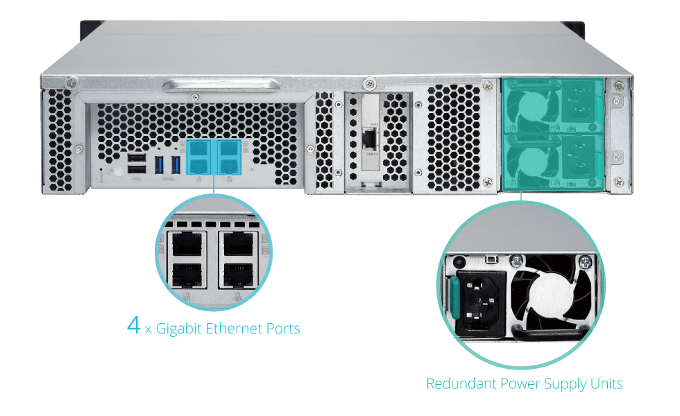 Biznesowy model TS-863XU-RP zaprojektowano do pracy przez całą dobę, 7 dni w tygodniu. Obsługa kompleksowych konfiguracji RAID i wymiany dysków podczas pracy zapewnia ciągłość usług. Zaawansowana technologia przywracania RAID firmy QNAP pomaga w razie przypadkowego usunięcia prawidłowo działających dysków ze zdegradowanego woluminu RAID. System można odzyskać poprzez ponowne włożenie nieprawidłowo usuniętych dysków twardych w celu przywrócenia dostępu do danych. TS-863XU-RP zapewnia wysoką niezawodność i wydajność dzięki czterem portom LAN 1GbE, umożliwiającym obsługę wielu trybów trunkingu portów, w tym przełączania awaryjnego. Serwer TS-863XU-RP wyposażono też w wymieniany podczas pracy zasilacz nadmiarowy, aby w ten sposób zapewnić jak najdłuższy czas działania systemu bez przestojów.