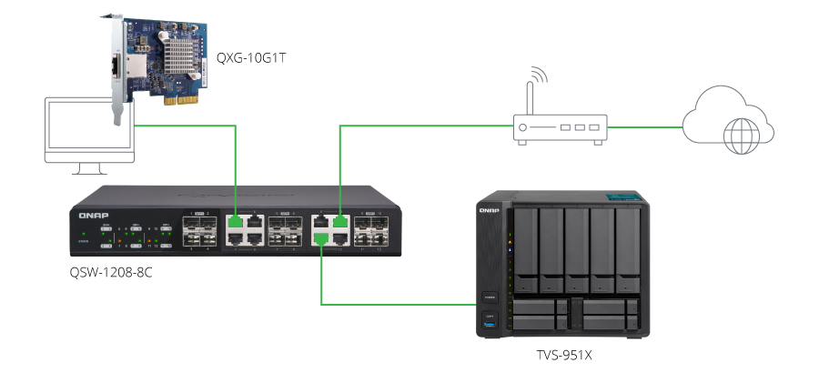 Model TVS-951X jest wyposażony we wbudowany port sieci 10GBASE-T, dzięki czemu zapewnia wysokiej prędkości łączność z siecią 10GbE. Przy użyciu modelu TVS-951X z niezarządzalnym przełącznikiem 10GbE firmy QNAP (kupowany oddzielnie) można zaktualizować infrastrukturę sieci, aby móc korzystać z większych prędkości transferu oraz usprawniając działanie aplikacji wymagających dużej przepustowości. Zarówno model TVS-951X, jak i niezarządzalne przełączniki 10GbE firmy QNAP obsługują technologię sieci NBASE-T o pięciu prędkościach (10 G / 5 G / 2,5 G / 1 G / 100 M), dzięki czemu nie ma potrzeby wymiany istniejących przewodów Cat 5e, 6 i 6a w aktualnej infrastrukturze sieci.