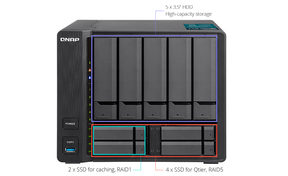 Ceny dysków SSD są coraz niższe, jednak utworzenie pamięci masowej wyłącznie na dyskach SSD jest nadal poza zasięgiem większości użytkowników, zwłaszcza, gdy ich wymogiem jest pamięć dużej pojemności. Model TVS-951X umożliwia korzystanie z konstrukcji hybrydowej pamięci masowej, która zapewnia korzyści zarówno dysków twardych, jak i dysku SSD, oferując wysoką pojemność i wydajność. Można elastycznie przydzielać aplikacje dyskom SSD, konfigurować pamięć podręczną SSD lub przy użyciu technologii Qtier™ automatycznie pozycjonować często używane pliki na dysku SSD w celu uzyskania najwyższych prędkości dostępu. Korzystając z tych funkcji, użytkownicy mogą w pełni zoptymalizować korzystanie z pamięci masowej modelu TVS-951X.