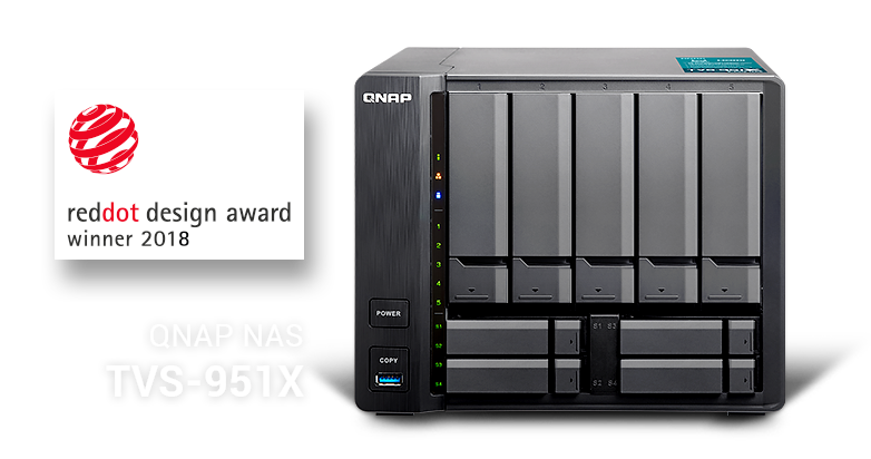 Model TVS-951X jest wyposażony w 7. generacji dwurdzeniowy procesor Intel® Celeron® 3865U o niskim zużyciu energii, dwukanałową pamięć 2 GB/8 GB DDR4 (do 32 GB) i hybrydową konstrukcję wnęk na dyski (w tym pięć 3,5-calowych wnęki i cztery 2,5-calowe wnęki), z obsługą do dziewięciu dysków. Po zainstalowaniu 2,5-calowych dysków SSD w ich dedykowanych wnękach można uruchomić buforowanie SSD i technologie automatycznego poziomowania danych Qtier, aby usprawnić ogólną wydajność systemu. Dyski SSD są coraz bardziej przystępne cenowo, dlatego model TVS-951X stanowi ekonomiczną pamięć masową o wysokiej wydajności dla małych i średnich przedsiębiorstw. Model TVS-951X jest także wyposażony we wbudowany port 10GBASE-T/NBASE-T, umożliwiając budowanie szybkiego środowiska sieciowego 10GbE.