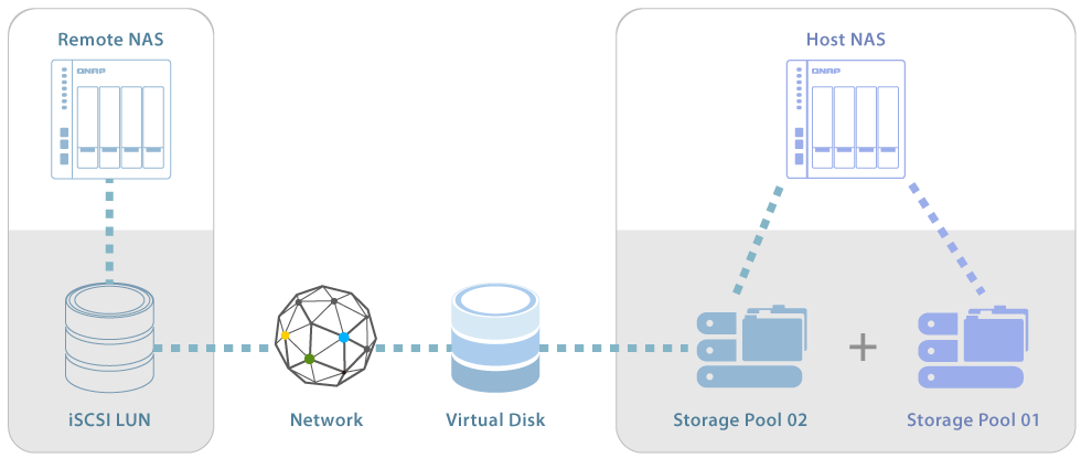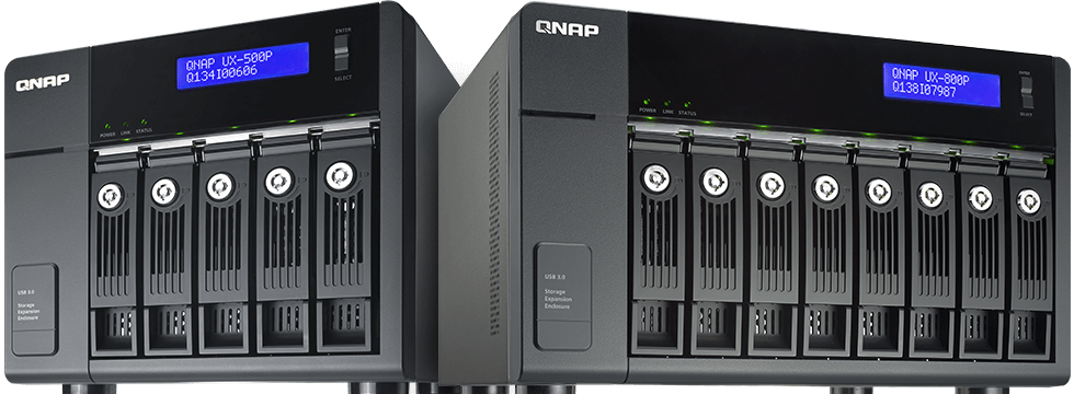 Oprócz konwencjonalnych modułów rozszerzających, model TS-963X może korzystać z technologii wirtualnej grupy JBOD firmy QNAP, co pozwala korzystać z nieużywanej pamięci masowej innego serwera QNAP NAS.