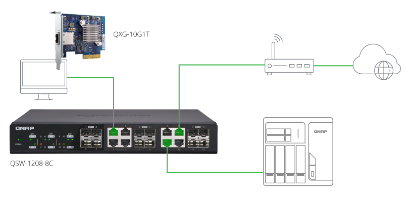 Niezarządzalne przełączniki QNAP 10GbE/NBASE-T™ umożliwiają błyskawiczną aktualizację środowiska sieciowego w korzystnej cenie. Dzięki sieci 10GbE możesz korzystać z niezwykle wysokich prędkości przesyłu, usprawniając zadania wymagające dużych przepustowości, np. wirtualizacje, oraz umożliwić jednoczesny dostęp w czasie rzeczywistym do dużych plików na serwerze NAS przy użyciu wielu stacji roboczych (idealne do edycji wideo i multimediów). QNAP zapewnia także kartę rozszerzeń sieci 10GbE PCIe dla komputerów z systemem Windows®/Linux®, zapewniając korzyści środowisk LAN o wysokich prędkościach.