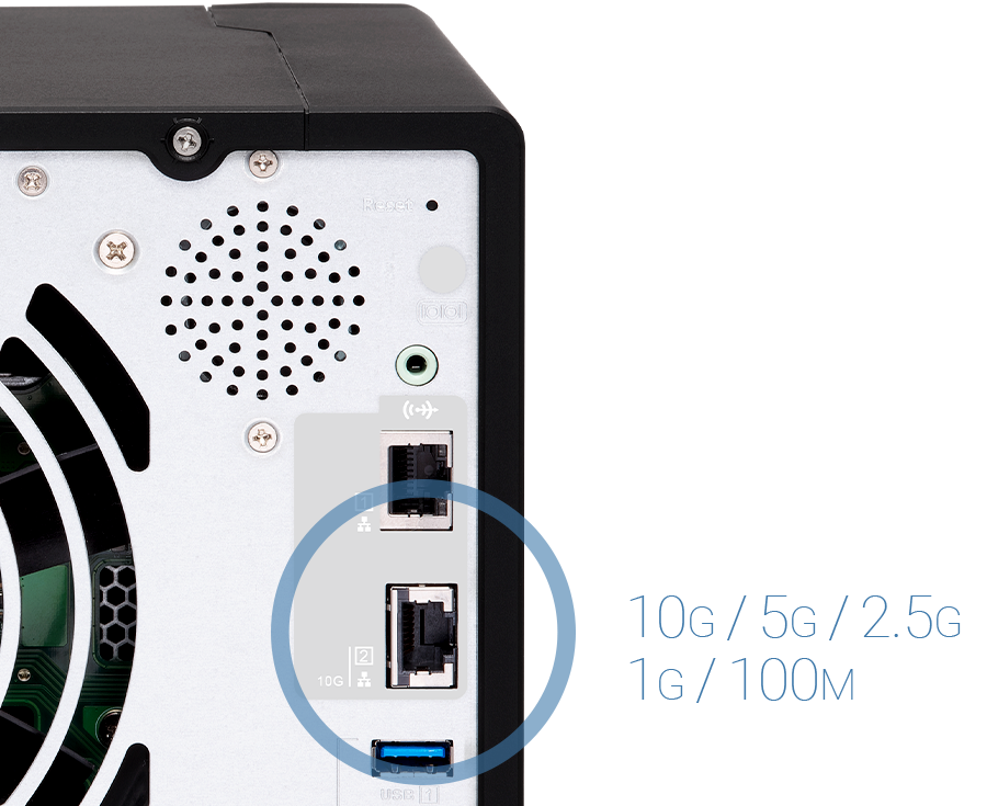 Model TS-963X obsługuje gotowe rozwiązanie połączenia 10 GbE dzięki wbudowanemu portowi 10GBASE-T, który obsługuje pięć prędkości (10G / 5G / 2,5G / 1G / 100M). Port 10GBASE-T korzysta z Aquantia® AQtion™ AQC107, wielogigabitowego kontrolera Ethernet klasy korporacyjnej, który umożliwia szybkie wykonywanie wielu zadań, np. transferów baz danych oraz tworzenia kopii zapasowych pamięci masowych maszyn wirtualnych i dużych ilości danych.