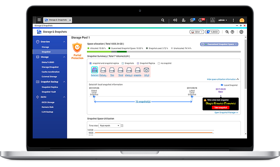 Mechanizm migawek ma kluczowe znaczenie dla bezpieczeństwa danych na serwerze NAS, ponieważ umożliwia zapisywanie kompletnego stanu systemu NAS wraz z metadanymi. Migawkami można wygodnie zarządzać w Menedżerze pamięci masowej i migawek lub w aplikacji File Station, a w razie awarii wykorzystać je do szybkiego przywrócenia sprawności systemu. W systemach QNAP stosowane są migawki blokowe, w których zapisywane są tylko te dane, które uległy zmianie od poprzedniej migawki. Pozwala to oszczędzać miejsce na dysku, a dodatkowo bardzo przyspiesza tworzenie i odtwarzanie kopii zapasowych. Model TS-332X z 4 GB pamięci RAM obsługuje maksymalnie 256 migawek na serwer NAS i maksymalnie 64 migawki na wolumin lub jednostkę LUN.