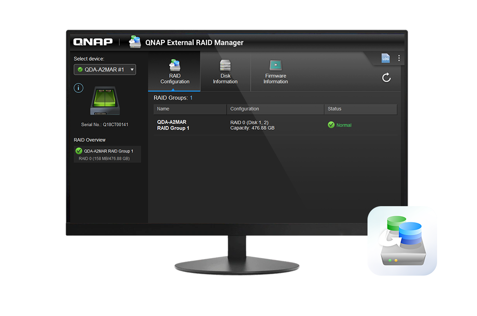 Narzędzie QNAP External RAID Manager umożliwia użytkownikom systemu Windows® wyświetlanie informacji o stanie dysku i trybie RAID urządzenia QDA-A2MAR. Przy użyciu narzędzia External RAID Manager można także zarządzać aktualizacjami oprogramowania układowego dla urządzenia QDA-A2MAR.