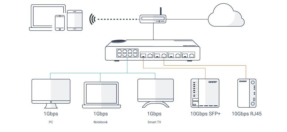 Model QSW-M408-4C jest wyposażony w cztery porty combo 10GbE SFP+/RJ45 oraz osiem portów Gigabit. Model QSW-M408-4C, zgodny z technologiami 10GbE i NBASE-T umożliwiającymi obsługę pięciu prędkości (10 G / 5 G / 2,5 G / 1 G / 100 M), oferuje wyższe szybkości transmisji, jeśli używany z istniejącymi kablami.