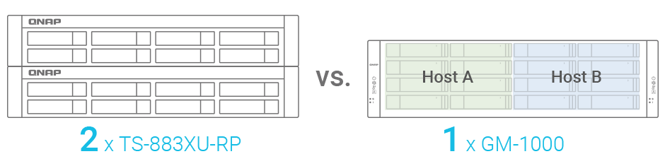 The GM-1000 series features a unique dual-NAS architecture that delivers cost-efficient and space-saving advantages. It contains two replaceable TNS-h1083X NAS nodes, which are powered by Intel® Xeon® E processors and provide high-performance 10GbE / 2.5GbE connectivity and expandable I/O. M.2 and U.2 SSD interfaces are also included to enable cache acceleration for tackling the performance wall in bandwidth-demanding and low-latency business applications (such as intensive backup and virtualization). Both TNS-h1083X NAS nodes use the ZFS-based QuTS hero operating system that supports block-level inline data deduplication and compression, near-limitless snapshots, real-time SnapSync, and more business-oriented features to achieve reliable service-level agreement performance.
